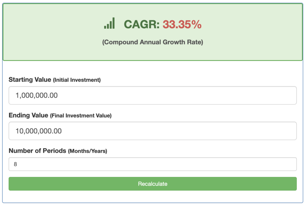 首先,要在8年間從100萬演變成1000萬,股票的複合年均增長率(CAGR) 需要達到33.35%,代表股票需要連續8年平均毎年增長33.35%,才能夠讓你的資產從100萬變成1000萬。