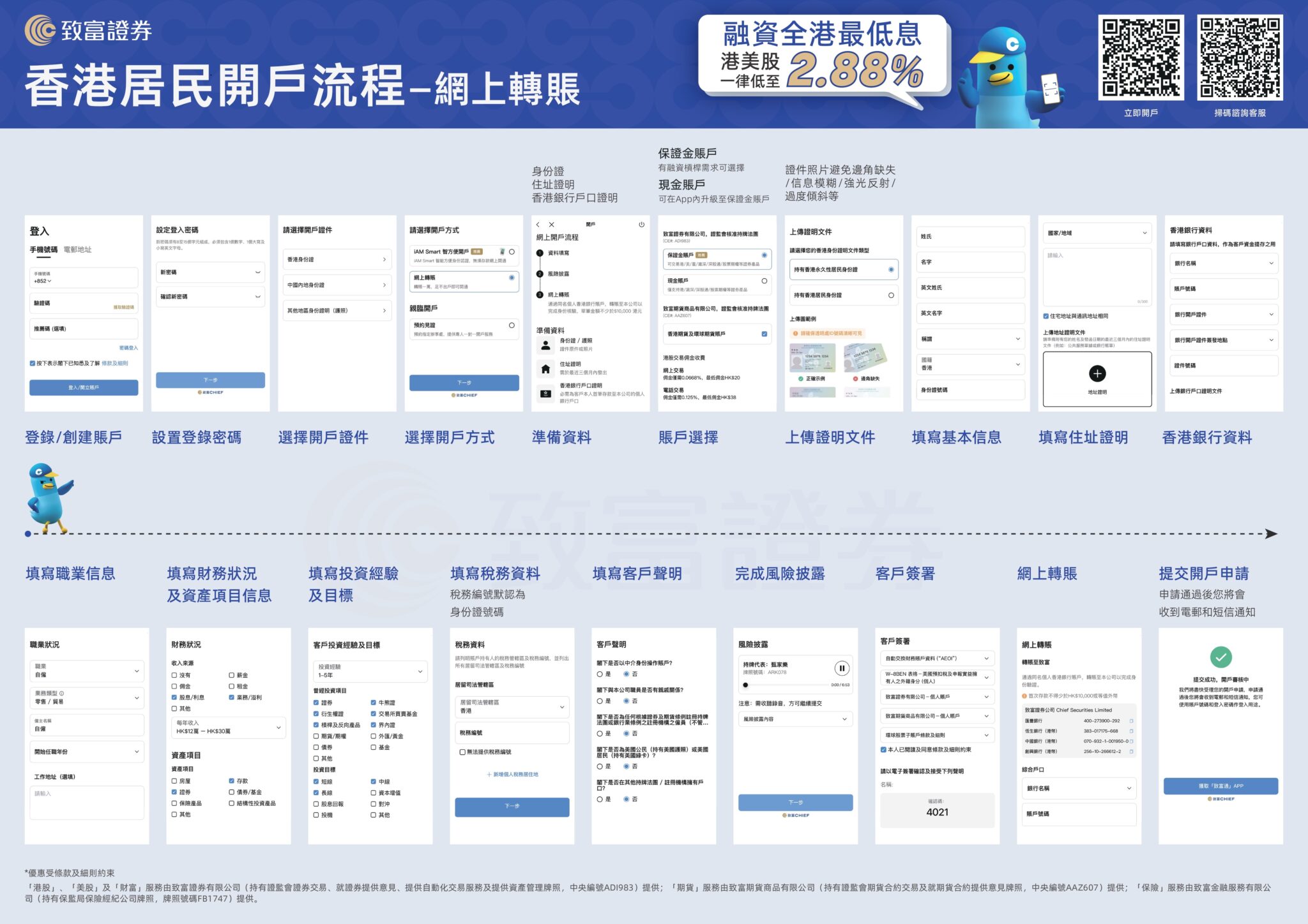 - 填寫資料: 包括基本信息、職業狀況、財務狀況及資產項目。