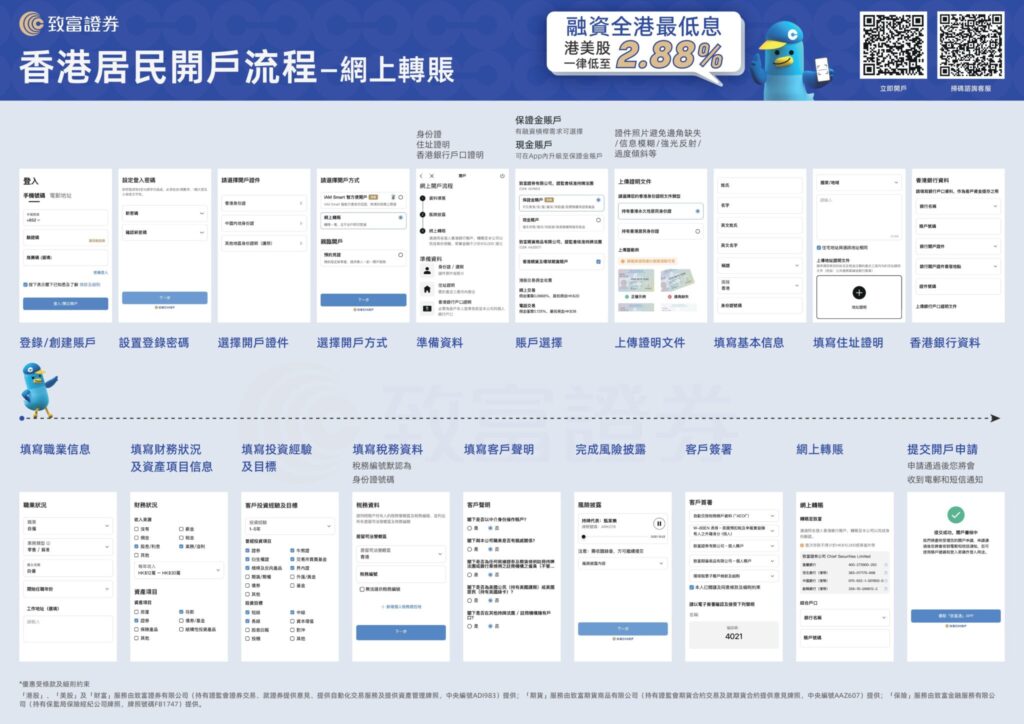 致富證券提供「非香港居民」與「香港居民」兩套線上開戶路徑,核心步驟大同小異,但在驗證方式上有所區別。