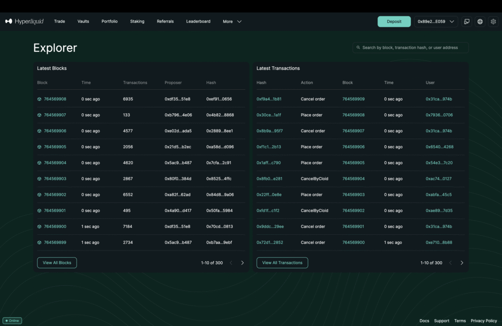 Hyperliquid 的另一個技術核心是鏈上訂單簿(on-chain orderbook),所有交易均在鏈上撮合並可被追蹤核證(透過Hyperliquid Explorer可追蹤毎筆交易),交易數據公開透明,能夠達到DEX完全去中心化的目標。