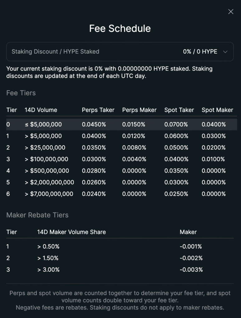 從手續費結構上,Hyperliquid目前的收費比 Binance 略低,但在若用戶在幣安上以 USDC 交易則可享掛單0手續費優惠,