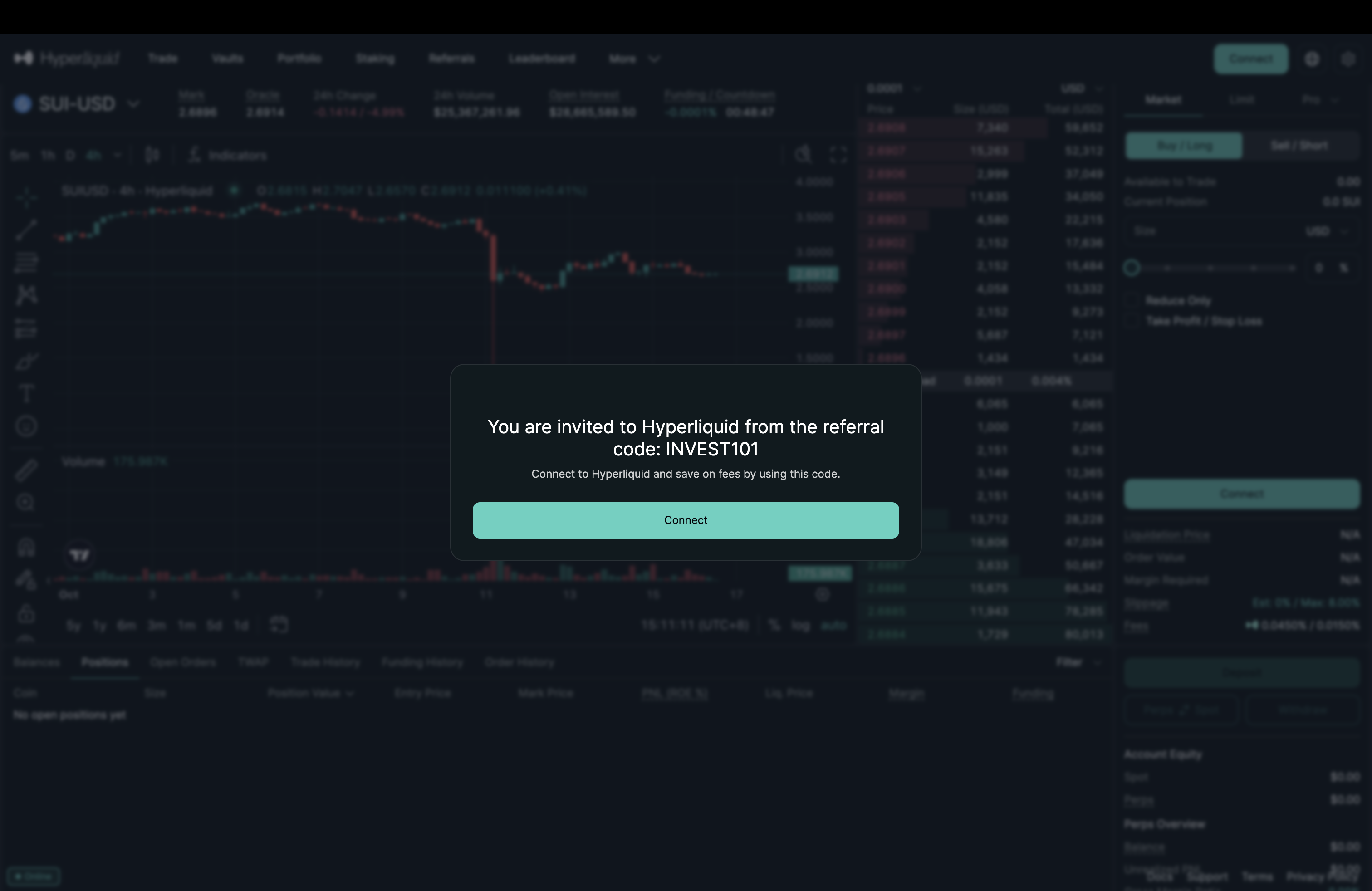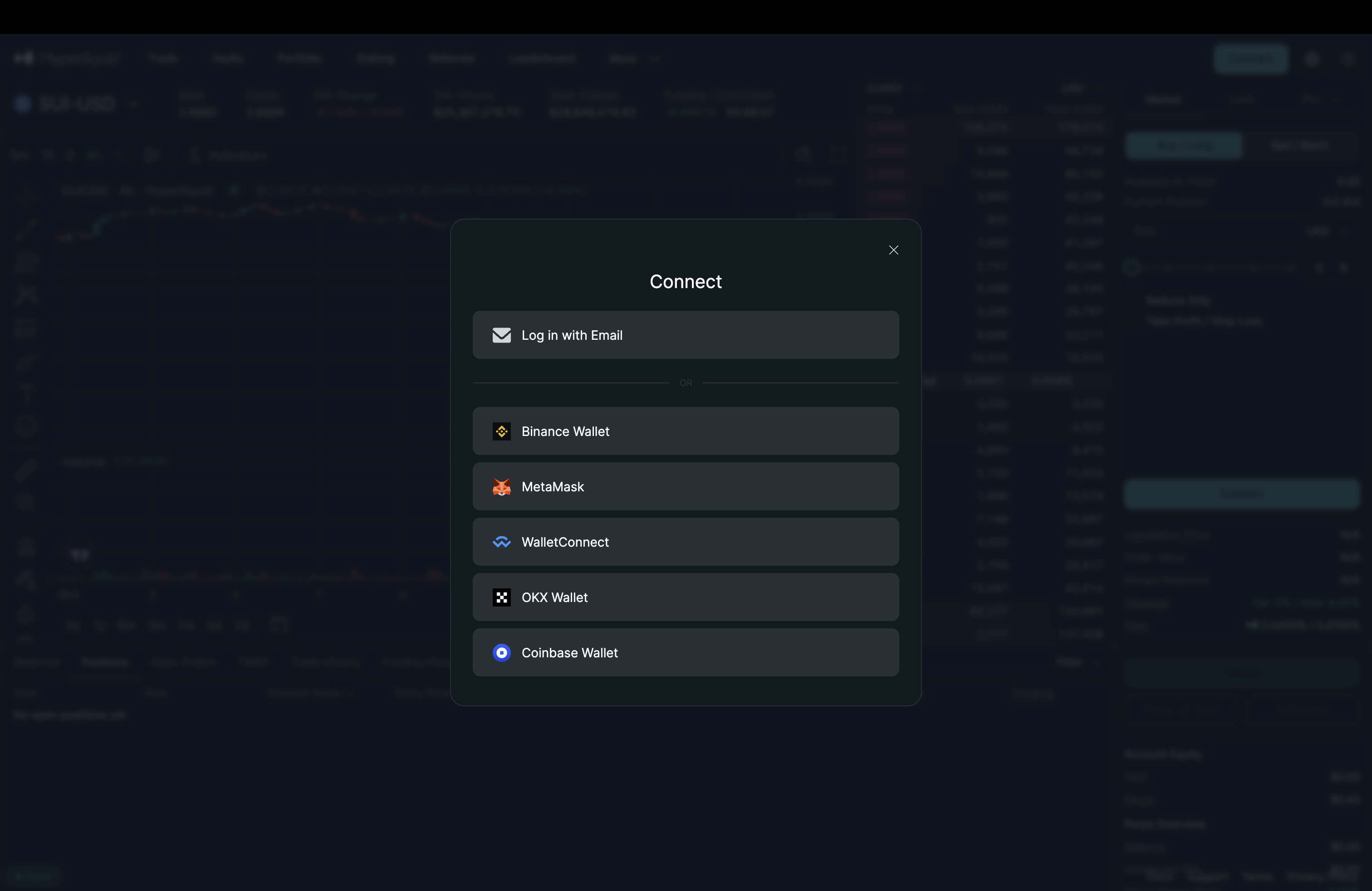 先到訪 Hyperliquid 交易所的官方網頁,點選「Connect」連結個人錢包。Hyperliquid 支持 MetaMask、Binance Wallet、OKX Wallet、Coinbase Wallet、Rabby 及其他兼容 WalletConnect 的錢包。用戶需簽署一則訊息以同意平台條款,此步驟不消耗 Gas。